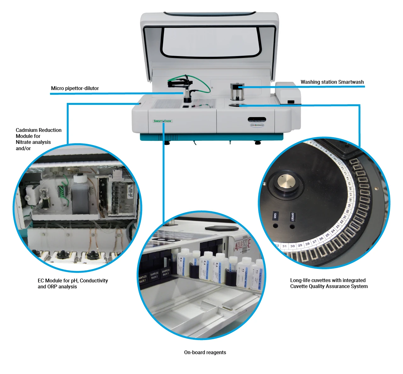 SmartChem® 200 Discrete Analyzer is a fully automated wet chemistry analyzer designed for photometric and electrochemical analyses, capable of processing up to 200 tests per hour. It features optional modules for pH, conductivity, ORP analysis, and nitrate sample preparation, alongside a reagent cooling system, barcode reader, and a unique onboard nitrate cadmium reduction module with regeneration capability.