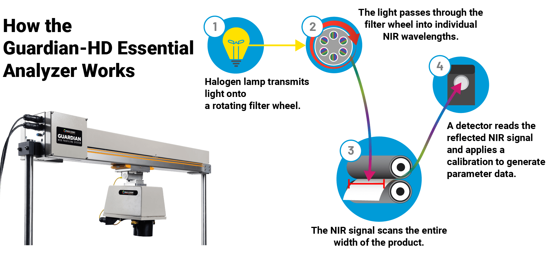 The Guardian-HD Series features a Near Infrared (NIR) sensor that connects to a traversing frame that continually scans material across the width of the web for real-time analysis of important quality parameters. Moisture and coat weight measurements from the Guardian-HD Series can be made on many substrates and for wet-end and dry-end application processes.